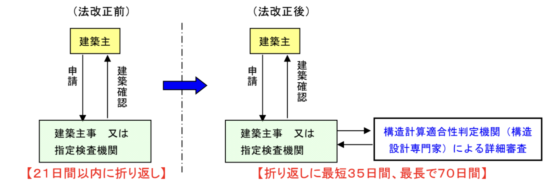 - 適合性判定期間が追加されることで、従来21日間以内と規定されていた建築確認申請の審査期間が最短で35日間、最長で70日間必要となります。