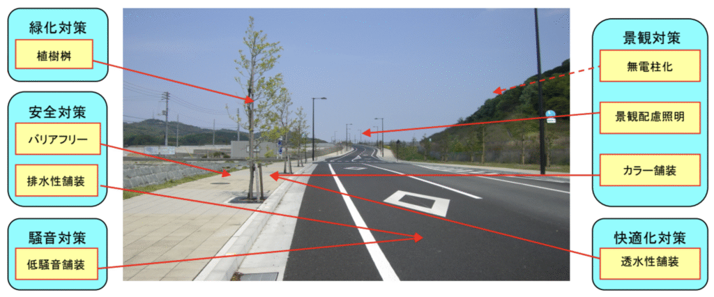 段差の少ない適切な幅の歩道を構築することにより、高齢者、身体障害者を含め全ての人が安心してスムーズに移動できる歩行空間を確保する。 - 緑化対策(植樹桝)、景観対策(無電柱化・景観配慮照明)を取り入れる。