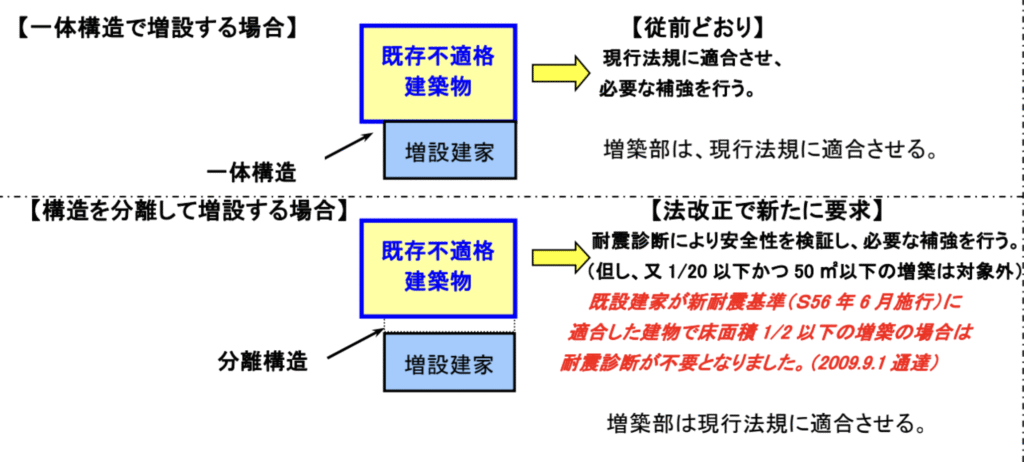 従来、既存不適格建築物と構造体を分離して増設する場合は、殆どの場合、既存建築物に対する現行構造法規の遡及を要求されていませんでしたが、平成17年6月に建築基準法が改正され、一体構造で増設する場合だけでなく、構造を分離した場合についても既存建築物の構造検討とそれに基づく補強が必要となりました。