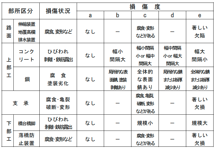 | 評価 | 点検の結果確認された損傷を、部所別に5段階の損傷度に区分して評価 |