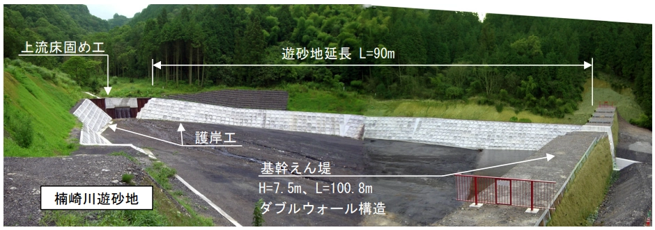 遊砂地は、渓床を維持するための下流基幹えん堤と上流床固め工、及び河岸を保護するための護岸工により構成されます。基幹えん堤の構造は、早急な施工と現地発生土砂の有効活用を目的に鋼製ダブルウォール構造としています。本施設により、約19,000m3の土砂を堆積させる計画です。