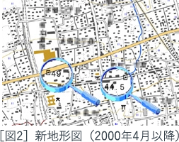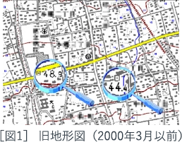 2000年3月以前の地形図(旧地形図)が図1で、水準点の標高は1969年~1972年の間に実施された測量結果に基づき公表された値が表示されています。