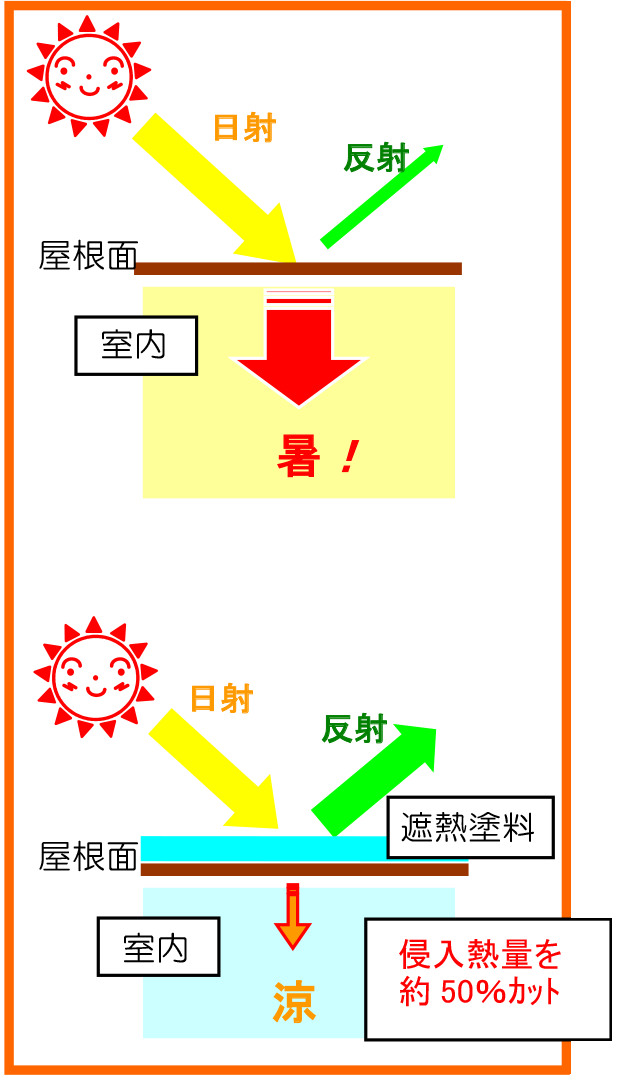 遮熱塗料とは、屋根面に塗装するだけで省エネ効果が得られる塗装材料です。太陽熱を反射させることで、表面温度の上昇を防ぎ、室内に伝わる熱移動及び室内温度の上昇を抑制し、室内環境の向上に役立っています。