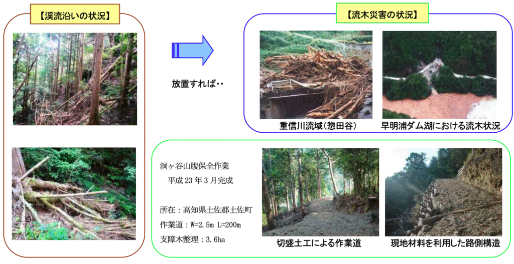 近年、手入れ不足の森林の増大に伴い、斜面崩壊や台風等による林内の倒木が豪雨により土石流や洪水とともに流出し、家屋を破壊したり、橋を閉塞して洪水被害を拡大する流木災害が頻発しています。