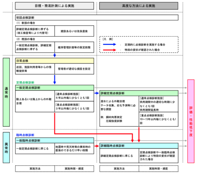 なお、特定技術基準対象施設については、港湾管理者への維持管理状況の報告を行う必要があります。また、港湾管理者による維持管理状況の立入検査、相当程度の変状が認められる施設に対し、必要な措置をとるよう勧告・命令が出される場合があるため、注意が必要です。