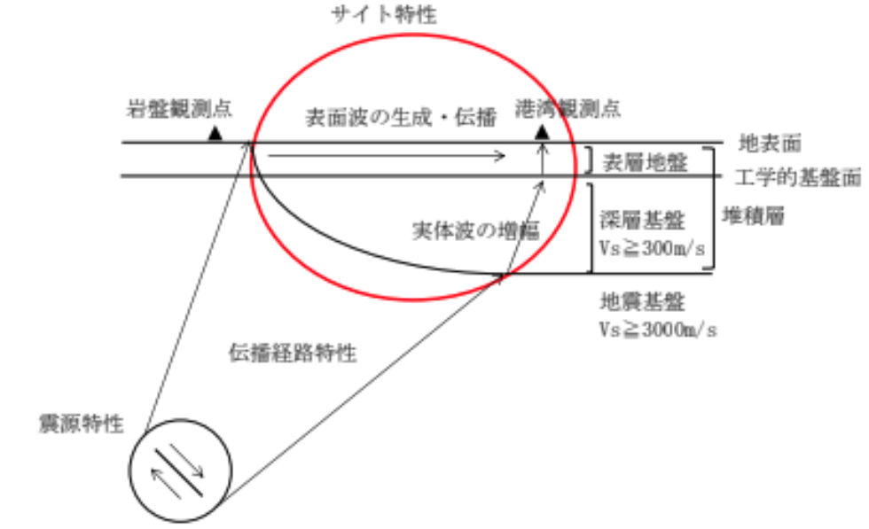 常時微動とは、地盤が地震時以外にも交通や工場の稼働、波浪、風に揺れる木々などを振動源として、人が感じないほどの小ささで常に揺れている現象のことです。 常時微動観測によって得られる水平方向と上下方向の揺れの比を計算して得られるピーク周期は、地盤の固有周期(揺れやすさの特徴)と関連があるとされています。堆積層によって地震波が増幅される度合いは、 場所によって異なる特性を示します。そこで、現地で常時微動観測を行い、その結果から、対象地点の近傍で判明しているサイト増幅特性を補正し、地震波を設定します。