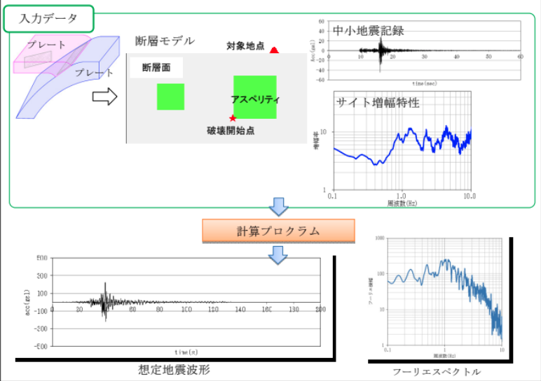 常時微動観測結果に基づいて補正されたサイト増幅特性の他に、断層モデルのデータ、中小地震記録を主な入力として、計算を行い、地震波形を作成します。 計算には、独立行政法人 港湾空港技術研究所から公開されているプログラムを使用します。