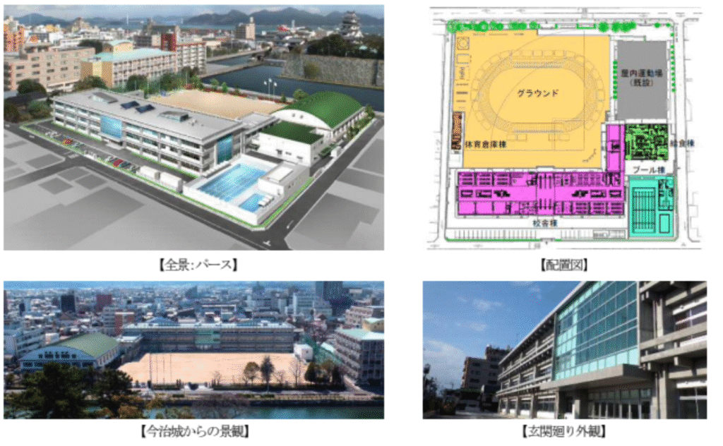 本施設と隣接する今治城は古来「吹揚城」と呼ばれ、今治市のシンボルとして市民の方々から親しまれています。 また、今治市は世界的も有名な建築家「丹下健三」氏の地元(旧美須賀小学校卒業)で、同氏はコンクリート打放しの端正なプロポーションを持つ 建物を数多く設計し、日本の建築にも多大な影響を与える等、地域の方々から今なお尊敬されています。校舎の外観は、今治城との調和と丹下健三氏の作風を細部に至るまで意識して 柱及び梁はコンクリート打放し、手摺壁にはプレキャストコンクリート(既製コンクリート)を用いることで重厚さと雄大さを表現しました。