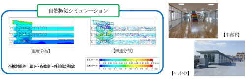 その手法として、中廊下と連続する階段部分の吹抜けをエコシャフトとして利用することを計画しました。エコシャフトを利用した換気計画においては、自然換気シミュレーションを用いて風速分布や温度分布等の解析を行い、自然に空気が流れるよう窓やガラリの配置、換気開口サイズを決定しました。その結果、無風時でも窓を開けるだけで、教室や中廊下に快適な風を生み出せることとなり、自然エネルギーの利用によって熱負荷を効果的に低減することができました。