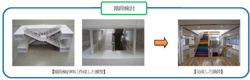 階段の形状は、子供たちの横の繋がりだけでなく、上下の繋がりにも配慮し、動線に自由度のあるX型を採用しました。採用するにあたり、模型を作成し、空間の拡がり方や階段の納まり、手摺の形状などを検討しました。