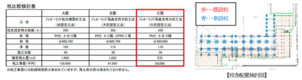 杭工法の選定に際しては、一般的によく用いられるプレボーリング拡大根固め工法(A案)とプレボーリング系高支持力杭工法(B案、C案)で概略計算し、 必要な杭径、本数、施行日数等を比較検討しました。その上で安価となるC案を採用することにより、コスト削減へと繋げました。尚、校舎の配置についても既設建物の杭に干渉しないよう検討することで既設杭の撤去削減に努めました。