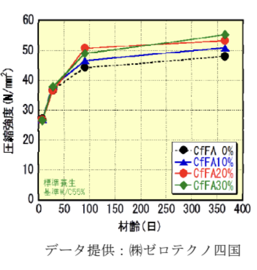 またこのグラフはCfFAを用いたコンクリートの圧縮強度を表しています。CfFAの配合が多いほど強度は高くなる傾向にあります。また材齢が進むほど強度を発揮するため、4週での試験結果よりも高い強度を期待できます。