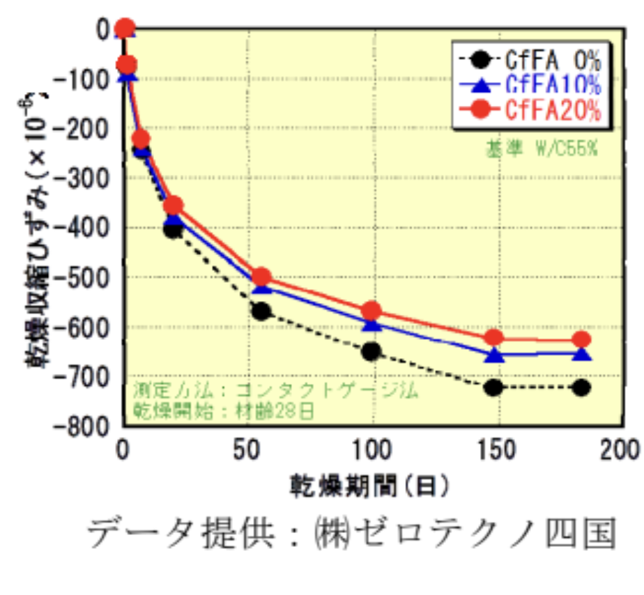 コンクリートの収縮試験は100x100x400mmの供試体を作製し、ひずみ量を測定します。CfFAを用いた収縮試験の結果がこのグラフになります。