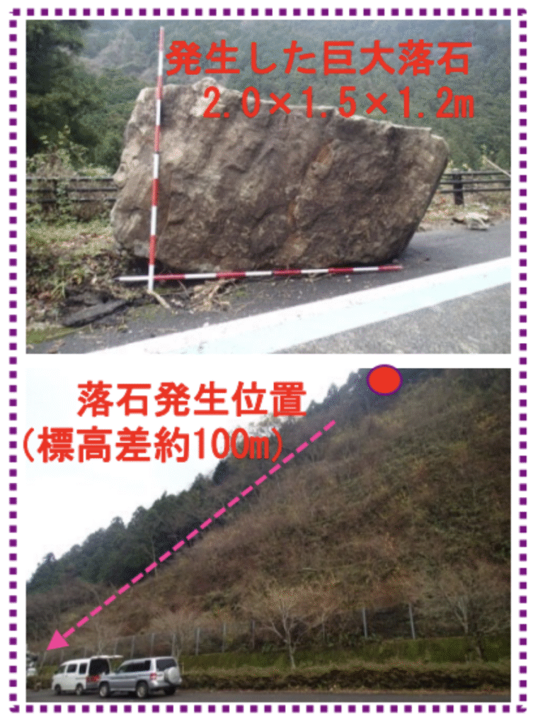 さる昨年12月25日、同道路において落石災害が発生し、既存の落石防護柵を破壊する等の大きな被害を伴い、年末年始を迎える中、早急かつ安全に復旧させ、かつ既往落石対策施設の機能強化が必要となりました。