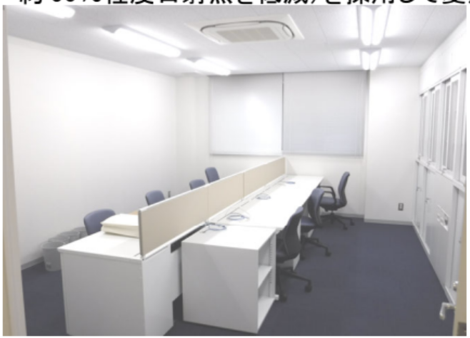 全ての部屋でLED照明を採用し、さらに2階南面の窓(執務室)に遮光フィルム(メーカー:スリーエムジャパン、シルバー35、約50%程度日射熱を低減)を採用して夏期の暑さ対策としております。