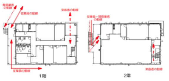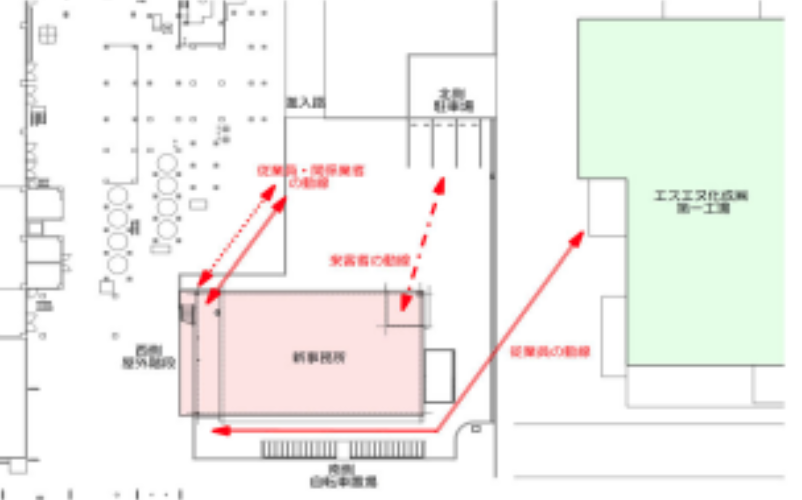 建築面では、操業に関わる従業員や来客者の動線を優先的に考慮し、建家内外における移動の際に従業員、関係業者、来客者の動線が交錯しないようにしました。