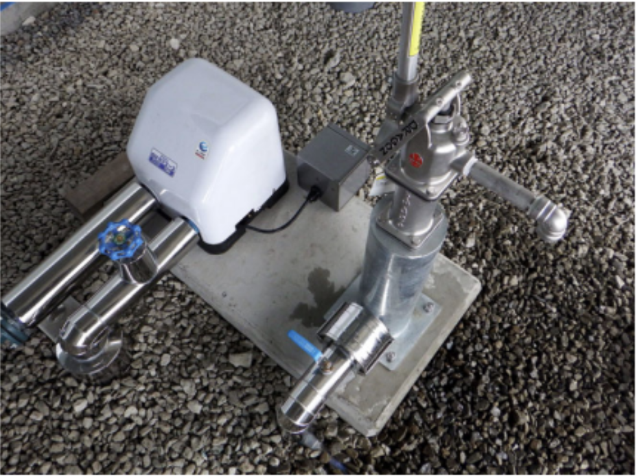 周辺地域は地下水の豊富な地域である為、屋外設備には井戸水 を利用する計画とし、電動井戸ポンプだけでなく、災害時にも利用可能な手押し井戸ポンプも併設しました。