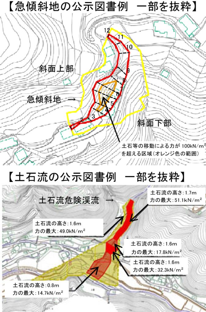 新築・増築・改築に着手する前に、建築物の構造が土石等の力に耐えられるかどうか(例えばRC構造の場合に単配筋構造が複配筋構造になる。高さは2階まで対応が必要となるなど)を確認します。作用する力の大きさや範囲、土石等の堆積高さは公示図書に示されています。