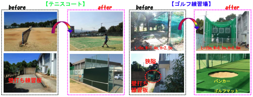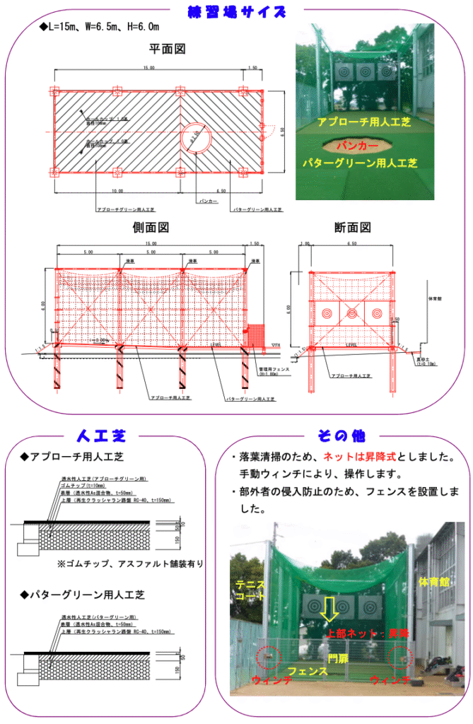 場外に設置されていた壁打ち練習板を、外周フェンス位置に設置する事で利便性を高めるとともに、小スペースであった隣接するゴルフ練習場の空間を拡大させました。