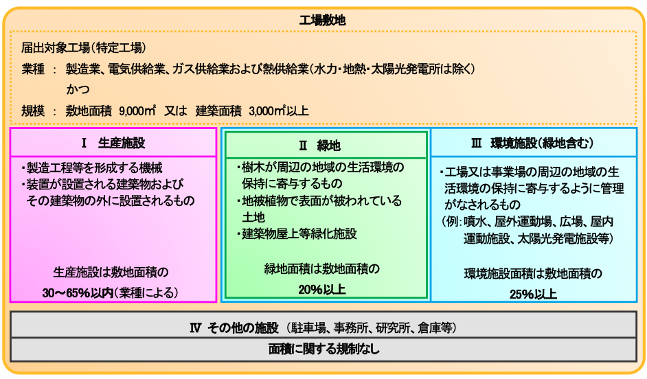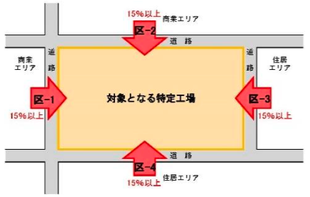 工場が立地する区画全体(区-1、区-2、区-3、区-4)の施設緑量比率が35%以上かつ一区画ごとの施設緑量比率が15%以上(※施設緑量比率は計算式で算出)