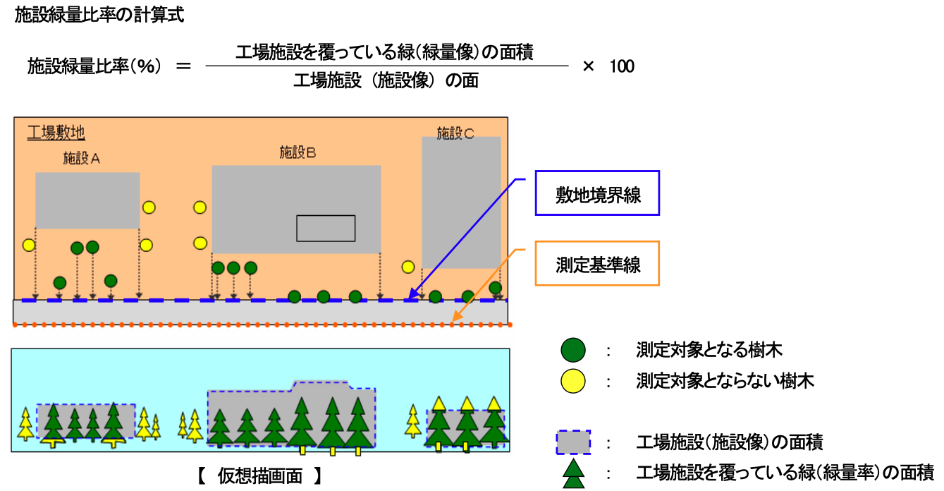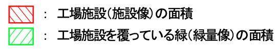 運用例規集2-2-3の③の運用では、工場等の敷地の周辺部その他の敷地内の土地に整備される樹木その他の植栽が、工場敷地内の建築物その他の施設を視覚的に覆う度合い(施設緑量比率)が一定程度以上であるか否かの判断が求められます。