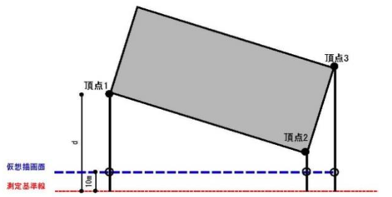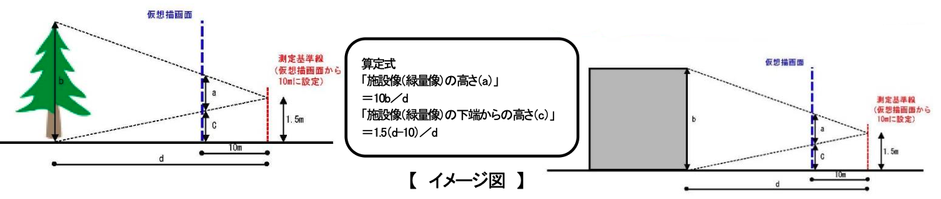 施設緑量比率を証明するうえで仮想描画面の作成は、測定基準線から工場施設の頂点までの距離、樹木の最高高さまでの距離および枝が張っている緑部分の各寸法を測定(イメージ図参照)する必要があり、難解な複数の課題を解決しなければなりません。そこで、担当行政に了承を頂いた弊社の証明方法を以下に紹介いたします。