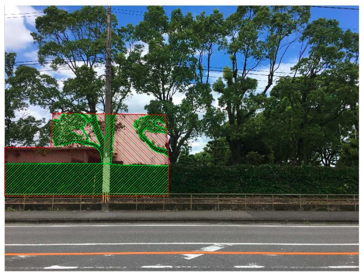 測定基準線から撮影した写真をCADに貼り付け、該当する施設像および緑量像を囲い、CAD上で算出した面積を施設緑量比率の計算式に代入し、比率を導きました。