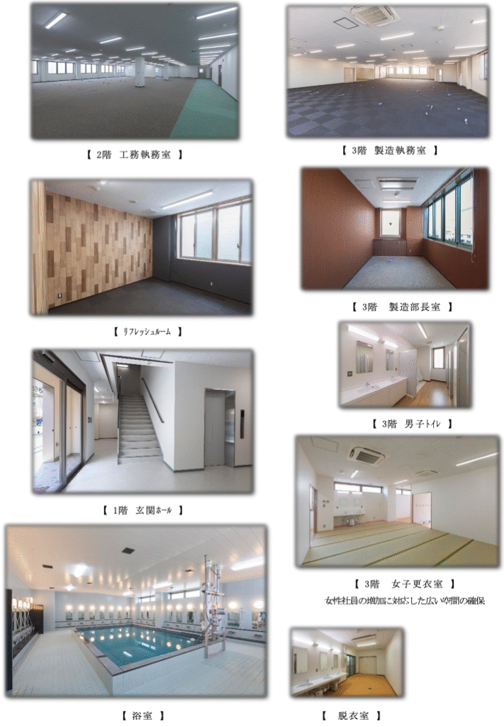 | 階構成 | 1F 更衣室・浴室(共用) 2F 工務部・CTL事務所 3F 製造部事務所 |