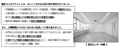 | 工事内容 | 防災警備建屋新設、工場正門出入口周辺整備 他 |