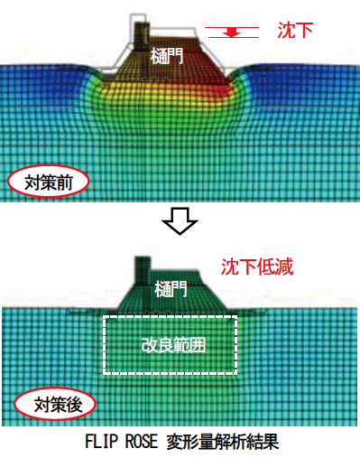 そこで、対策工法として「薬液注入工法」による地盤改良を選択し、その有効性確認は、動的解析法の一つであるFLIP ROSE®を用いて地震時の樋門の変形量を求めることにより行いました。その結果、液状化対策により樋門の沈下が抑えられ、対策工法が有効であることを確認しました。
