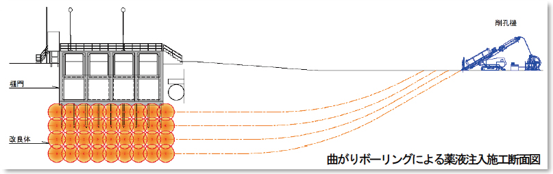 また、樋門を壊すことなく施工が可能な方法として「曲がりボーリング」を採用しました。曲がりボーリングは、3次元的な削孔が可能で、障害物を避けながら構造物直下の削孔・注入が可能な技術です。