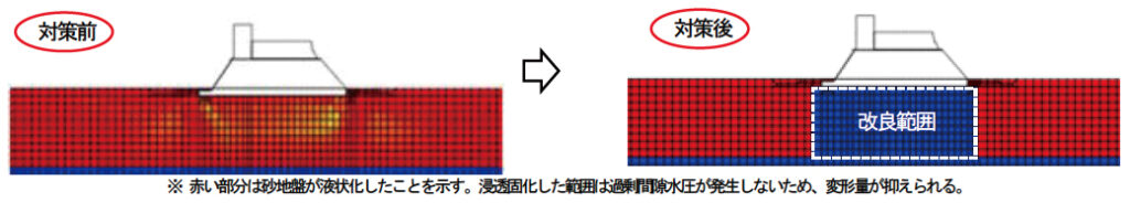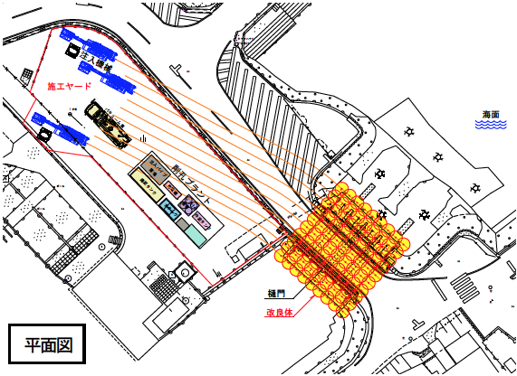 愛媛県新居浜市多喜浜新田海岸にある長岩樋門は、耐震性能照査の結果、地震による液状化によって大きく沈下し、必要な防護高さを確保できないと評価され、基礎地盤の液状化対策が必要でした。