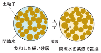 薬液注入工法とは、土粒子の間隙に薬液を浸透注入することで、間隙中の水を薬液に置き換え、地盤を固める工法です。薬液は、長期安定性を有するように改良された溶液型(水ガラス系)のものであり、環境安全性についても確認されています。