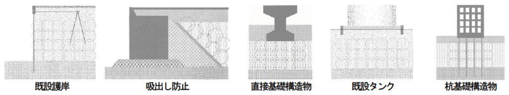 全国的に、堤防や護岸、建築物、タンク基礎の液状化対策・地盤改良工法として用いられています。