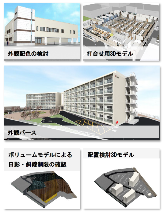 - 基本計画段階で3Dモデルを作成、日影や高さ制限を考慮した配置検討や立体計画ができる。