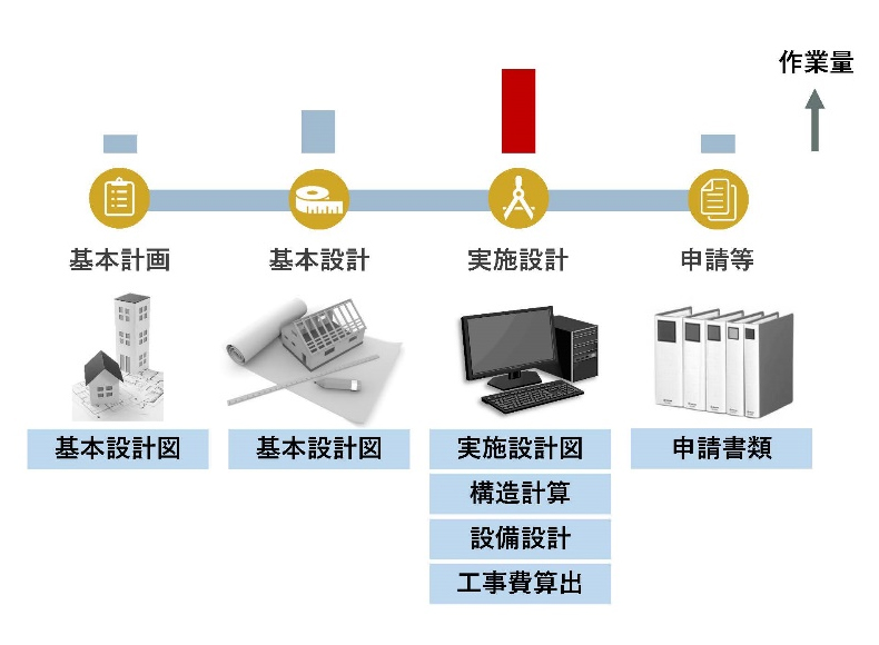 ⇒実施設計段階で構造設計や設備設計、積算等を行う為、仕事量がピークに至る。