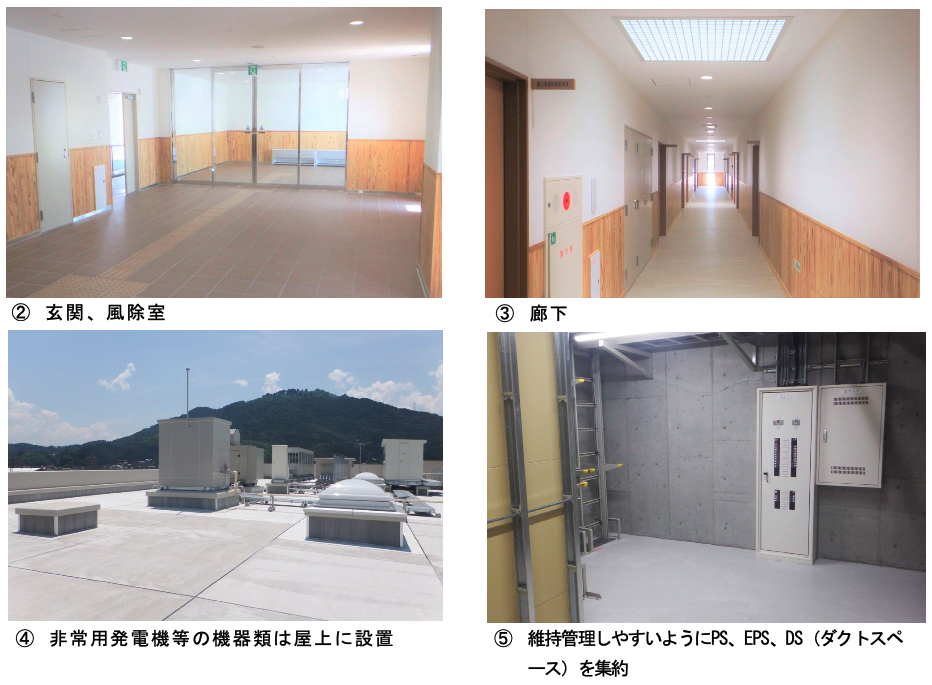 (保有水平耐力を1.25倍に割増して設計) - 1階は玄関、駐車場とし、執務室は2階以上に配置、受変電設備等重要機器を屋上に設置