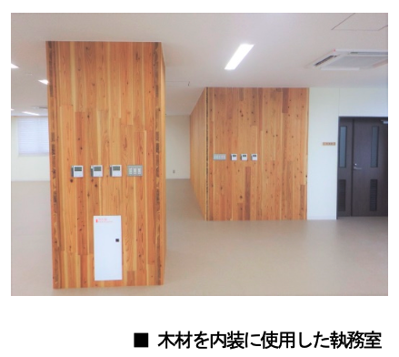 - 環境負荷の少ないCLT等の県産木材を内装材に利用