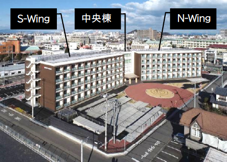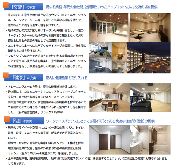 建家は、中央棟と北棟(N-Wing)、南棟(S-Wing)の3棟で構成されており、中央棟には、共用部分を集約し、北棟・南棟は寮室専用棟として配置しています。メイン入口のファサード部分にはカーテンウォールをあしらいシンボル性を高め、建家の配置については伸び行く住友化学をイメージして翼を広げた形状としました。