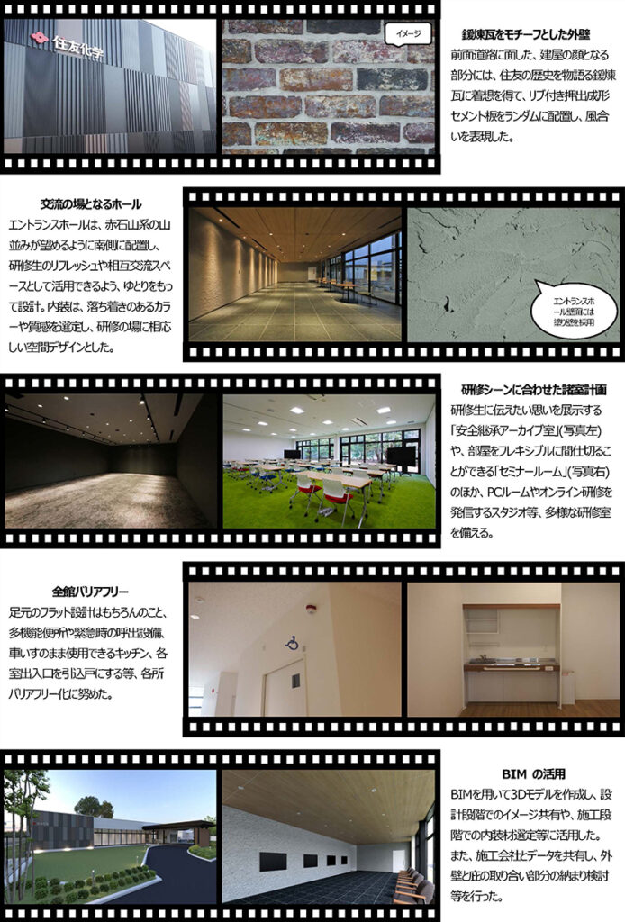 本建屋は、住友化学株式会社様の研修施設の高経年化及び研修の多様化への対応のため、従来の研修所に隣接する敷地に建設されました。内部はセミナールームやスタジオ、会議室などの諸室が備えられているほか、過去の改善事例や先人の知恵を学ぶ場として「安全継承アーカイブ室」が配置されています。
