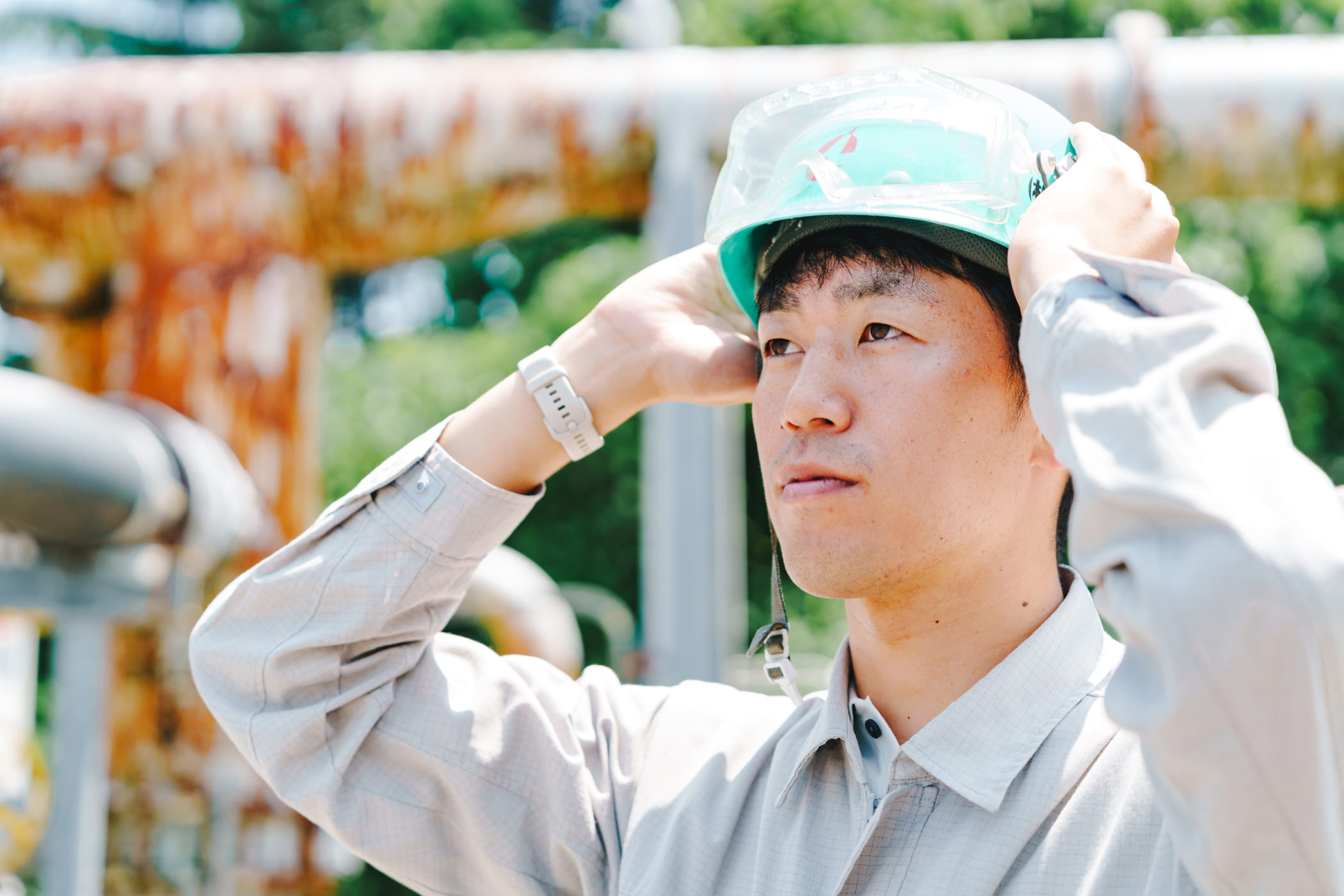 貯水槽の現場では施工計画書に沿って、作業の安全が確保されているかを確認。ヘルメットの顎ひもを正しく締めているかなど、服装についても住友化学の安全基準書に準拠してシビアにチェックする。道路工事の交差点の現場では、図面照合を入念に行う。